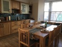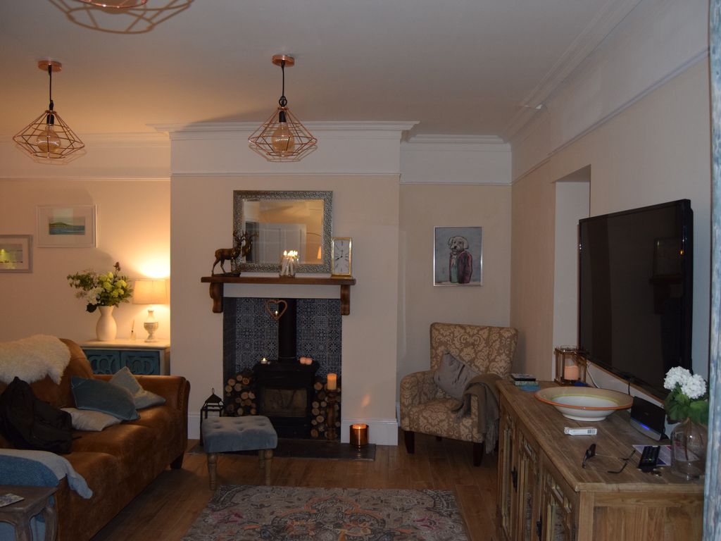 The downstairs is open plan, with comfortable three seater and two seater leather sofas, and a comfortable chair, in the lounge area. Working wood burner in an original fire surround. 49 inch smart television.
