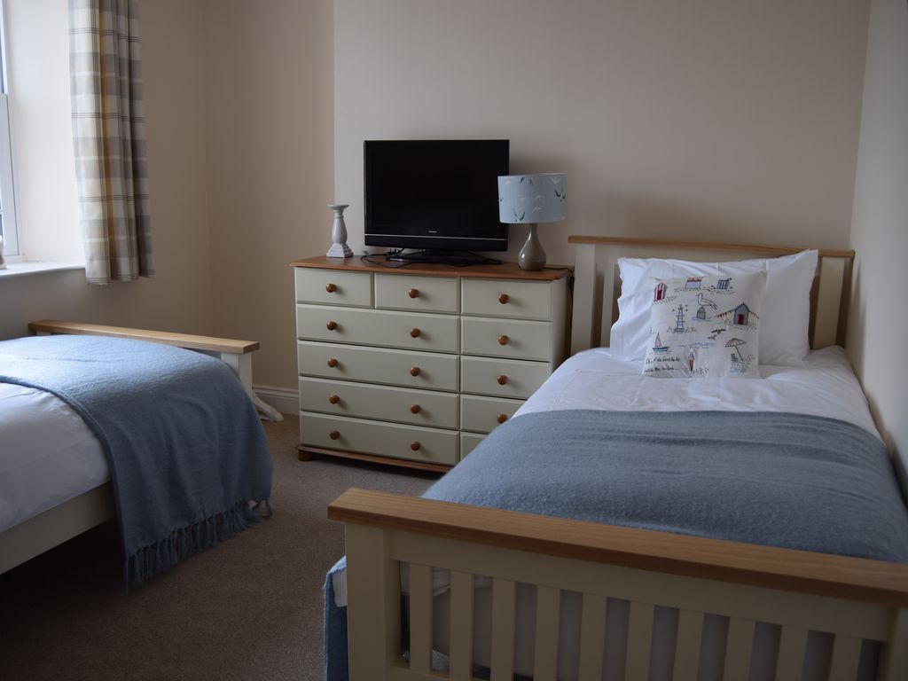 Twin bedroom with two single beds (television in room), next to main bathroom.