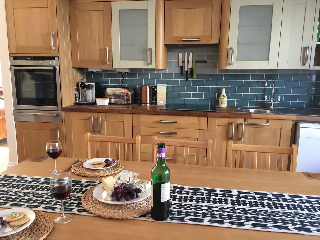Fully fitted modern kitchen with Smeg dishwasher, Neff oven and grill with plate warming drawer. Toaster, kettle, induction hob, Nespresso top of the range coffee machine (please bring your own Nespresso capsules if you want to use this), fridge, freezer, and large table to comfortably seat eight people.