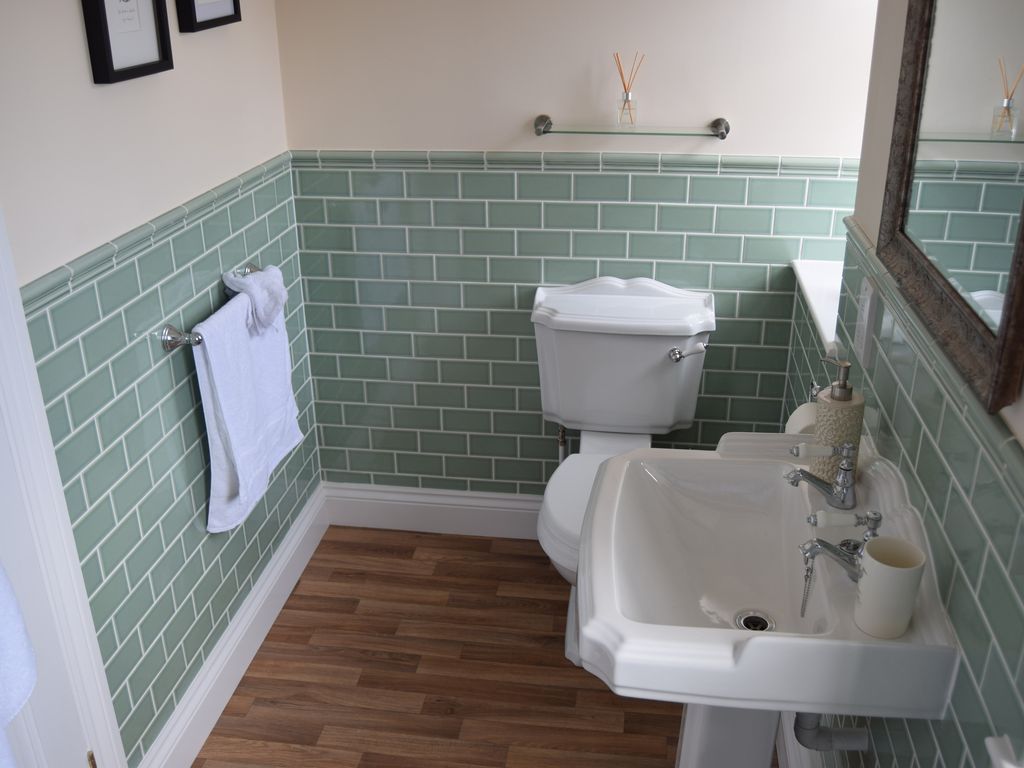 Utility room with washing machine, condenser tumble drier, sink and microwave. Some dog beds (large), dog cage, bowls, spare lead, emergency dog food etc provided. Downstairs toilet with basin.