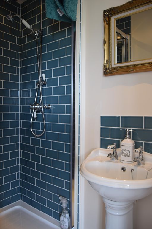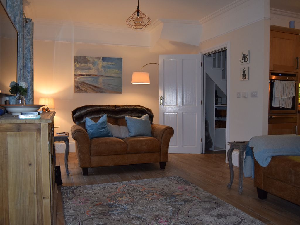 The downstairs is open plan, with comfortable three seater and two seater leather sofas, and a comfortable chair, in the lounge area. Working wood burner in an original fire surround. 49 inch smart television.